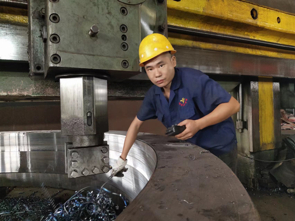 他為人憨厚老實,吃苦耐勞,服從安排,任勞任怨,做事專注細致,被張主任看在眼里記在心里。因此當8米立車一名師傅辭職后,他便按照“量才配崗”的原則,立即把趙江調到立車崗位,每天親自教他操作立車。通過他的嚴格要求,加上趙江堅持不懈的努力,他終于熟練掌握了立車的操作技術。如今,他在立車崗位上己經(jīng)做了兩年,前后己帶了兩位徒弟。每當同事夸他上手快時,他卻覺得自己的技術離師傅還有很大差距?!凹埳蠈W來終覺淺,絕知此事要躬行。張主任的親自教導、我從書本上自學來的知識,自己按條條框框操作,這是打基礎。領悟了圖紙的加工要求后,在保證質量的前提下,編寫好程序、各項參數(shù)、速度(包括進給速度和轉速)后,我還必須隨時觀察車床上的一舉一動,監(jiān)管加工全過程,在工作實踐中不斷發(fā)現(xiàn)問題、思考問題、解決問題、總結經(jīng)驗。當我能對具體問題具體分析具體解決并游刃有余時,我就從操作工變成師傅了,”趙江說。