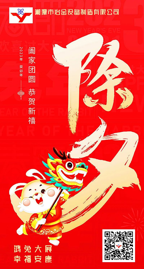”爆竹聲聲一歲除,歡天喜地迎新春“。在震天的鞭炮聲中,在滿天璀璨的煙花里,我們與2022揮手告別,與嶄新的2023年深情相擁……陪伴是最深情的告白,相守是最溫暖的承諾。除夕之夜,最大的幸福莫過于和家人團(tuán)聚,最大的快樂莫過于陪父母長輩談心,最好的祝福就從湘潭市冶金設(shè)備這里傳遞……值此農(nóng)歷除夕到來之際,國內(nèi)冶金礦山設(shè)備非標(biāo)定制專家——湘潭市冶金設(shè)備制造有限公司衷心祝愿所有客戶、伙伴、朋友、家人們:除夕團(tuán)圓! 新年歡喜!鴻兔大展! 萬事如意!祝天下所有父母:健康長壽,平平安安!祝天下所有家庭:溫馨和睦,幸福美滿!