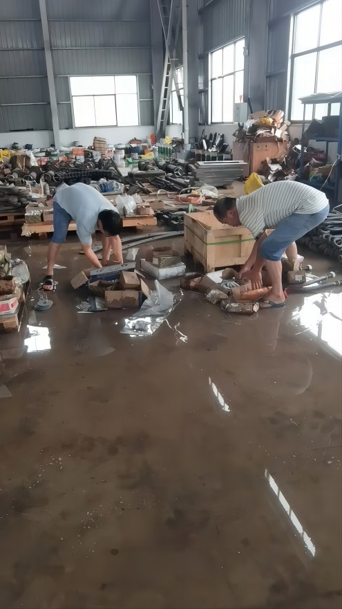 黨員張忠是在清晨六點多就奔赴車間前線,指揮員工譚正武迅速吊起8米立車,并與門衛(wèi)值班人員黃永輝一起搶救倉庫物資。7點后,干部們冒雨陸續(xù)趕往車間搬運物資,加固設備,確保生產線關鍵節(jié)點的安全。盡管衣服濕透,汗水混著雨水滴落,卻不敢有絲毫松懈,隨時備戰(zhàn)應急響應。
